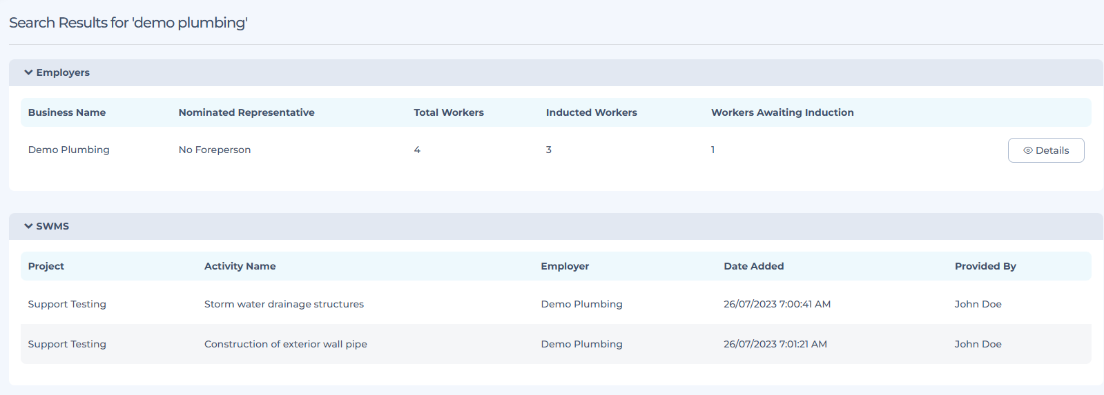 The search returns Employers and also any SWMS and Projects associated with this search.